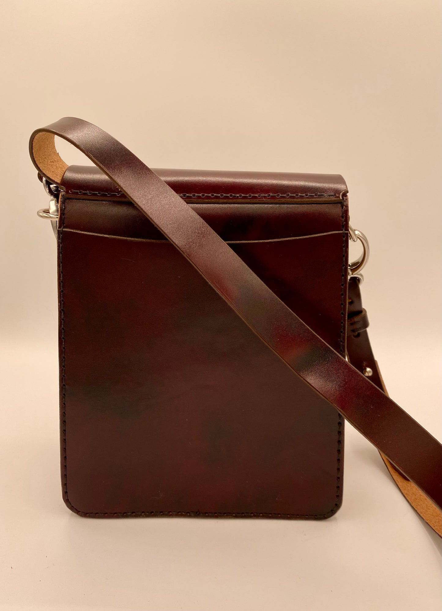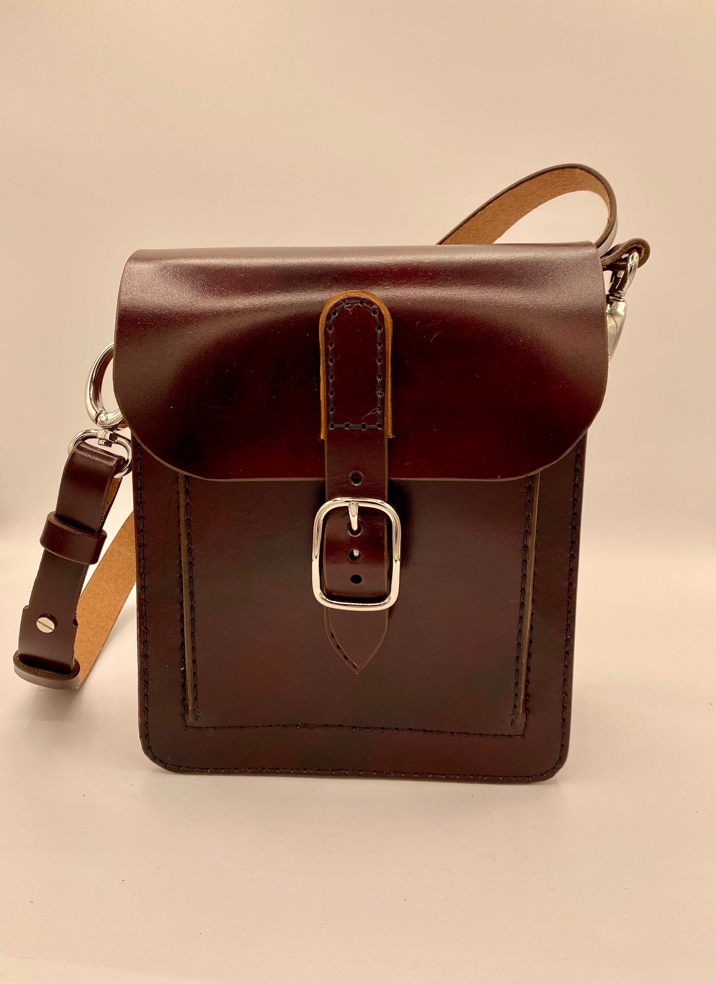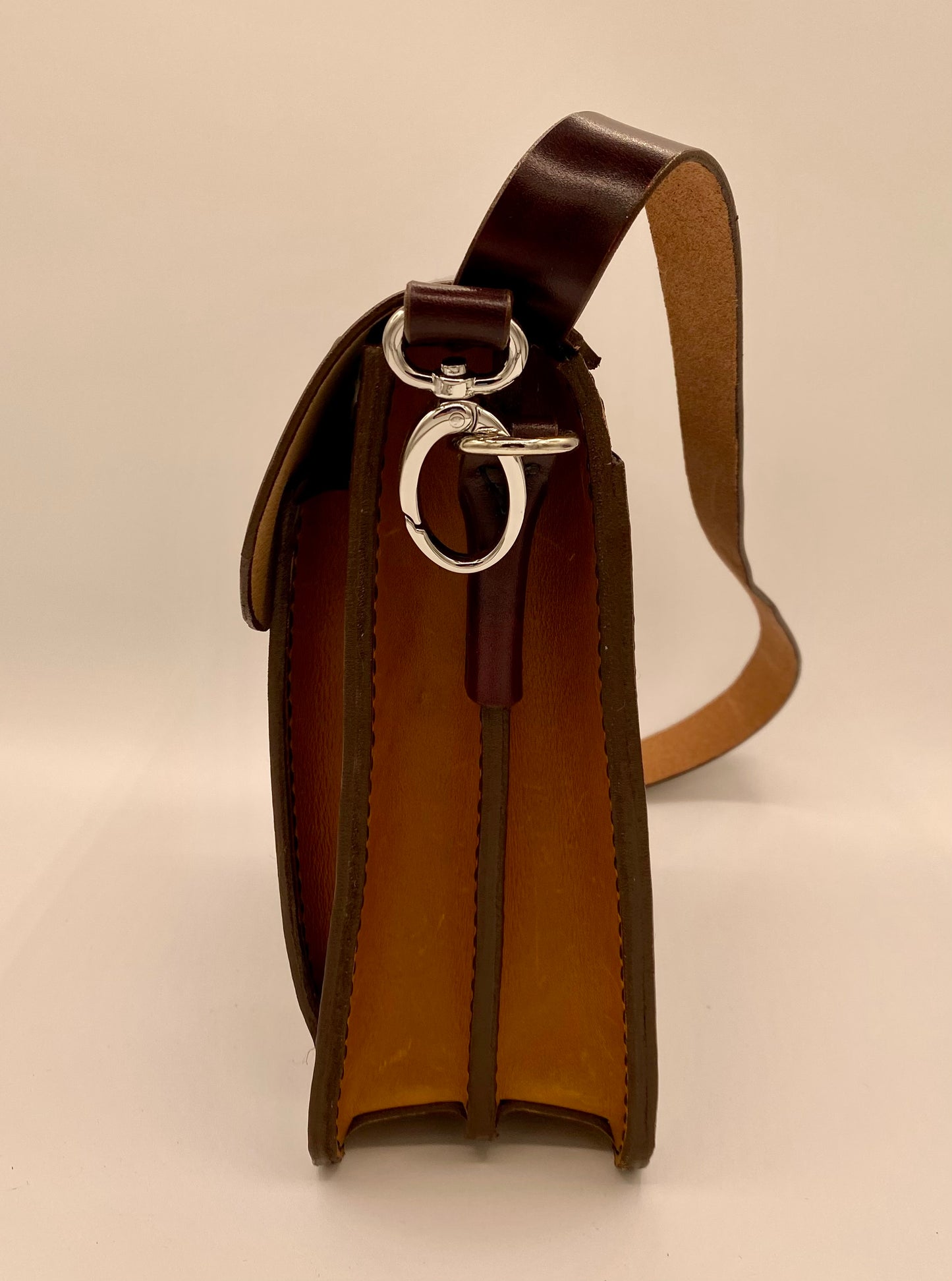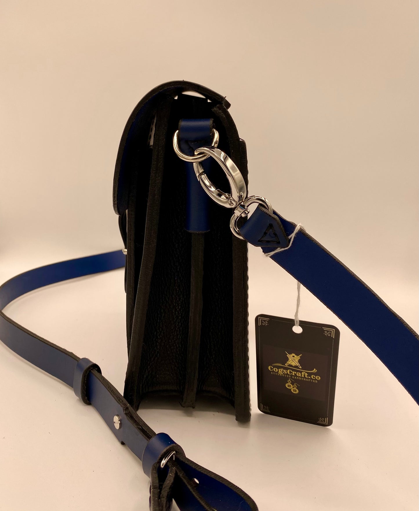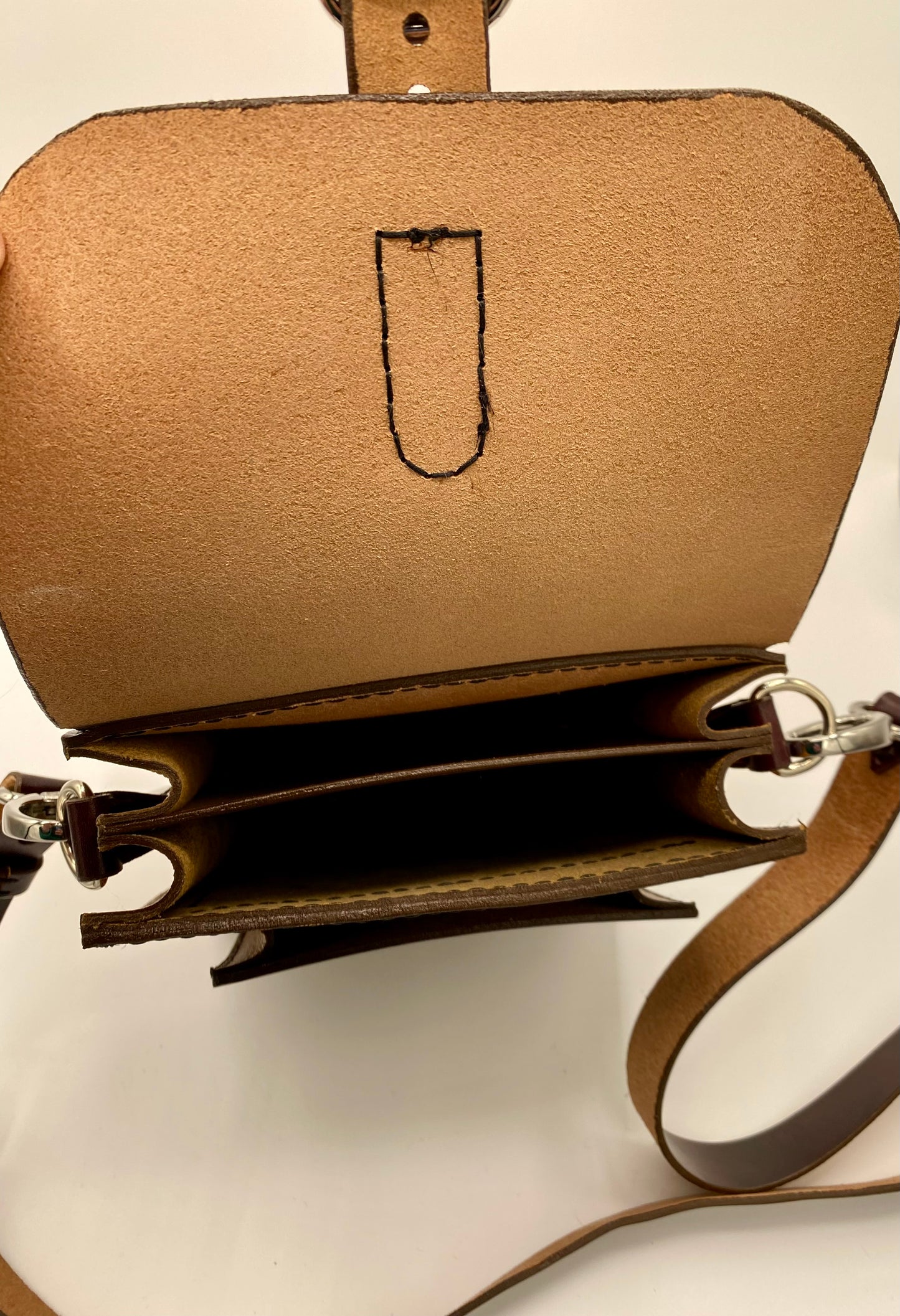 Penny is a fun bag with two compartments and a great cross-body strap. It's a nice size for your daily carry, holding all the essentials! Shown in Chrome Tan Navy Burl. Please allow 6-8 weeks for your custom order.